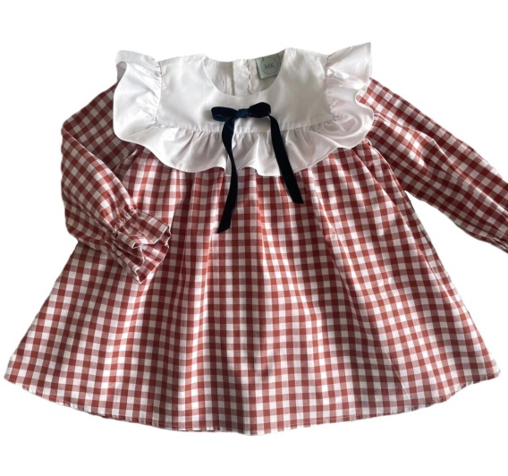 Sukienka ELISABETH Brick została uszyta z delikatnej dwustronnej bawełny w kratkę vichy. Biały karczek z falbankką oraz aksamitną kontrastową kokardką nadają sukience elegancji i niepowtarzalnego uroku. Całość na delikatnej bawełnianej podszewce.